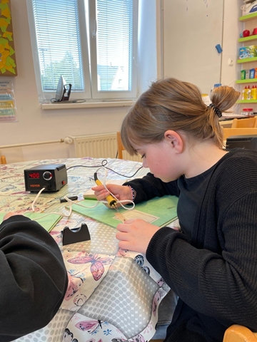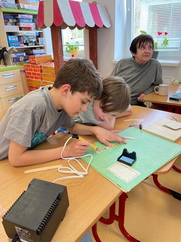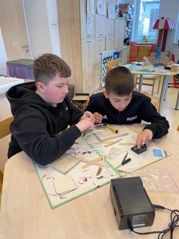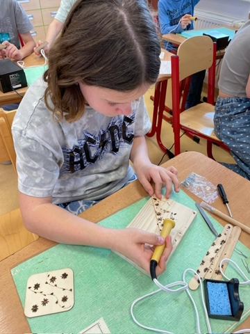 Využíváme i „retro“ stavebnice, které zná nejedna generace – například SEVU nebo Merkur. Jsou ověřené, kvalitní a pořád skvěle fungují. Zároveň školu postupně vybavujeme i novějšími pomůckami, které dětem otevírají další možnosti. Nejnověji jsme pořídili sady na vypalování do dřeva (pyrografii). Starší děti si vyzkoušely první lekci: učily se bezpečně zacházet s nástrojem, měnit hroty a podle vlastního návrhu vytvořit precizní obrázek. Je to práce, která vyžaduje soustředění, pečlivost a klidnou ruku – dovednosti, které se hodí nejen ve škole, ale i v běžném životě.